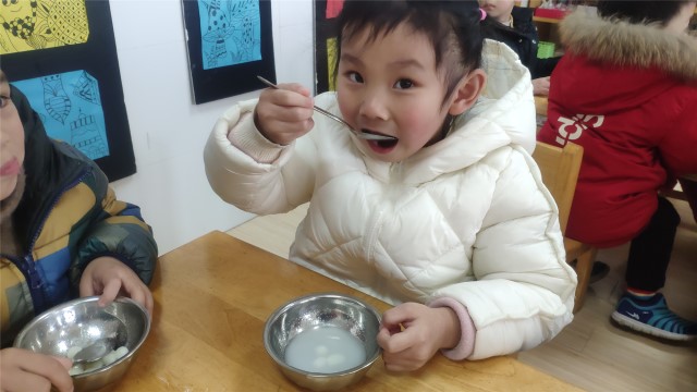 瞧,老师撸起袖子现场和面,孩子们目不转睛地看着,一盆白花花的米粉通过加水搅拌,不一会就揉成了一团,看!面和好了,我们一起来搓元宵吧。孩子们用一双双能干的小手搓出了一颗颗甜蜜的元宵。最后当然还得有品尝元宵,分享美食的环节,老师就将孩子们自己制作、煮好的元宵呈现在大家面前,孩子们都兴奋极了,叽叽喳喳地讨论着哪个是自己搓的元宵,内心的成就感全部显露在那张张笑脸上。