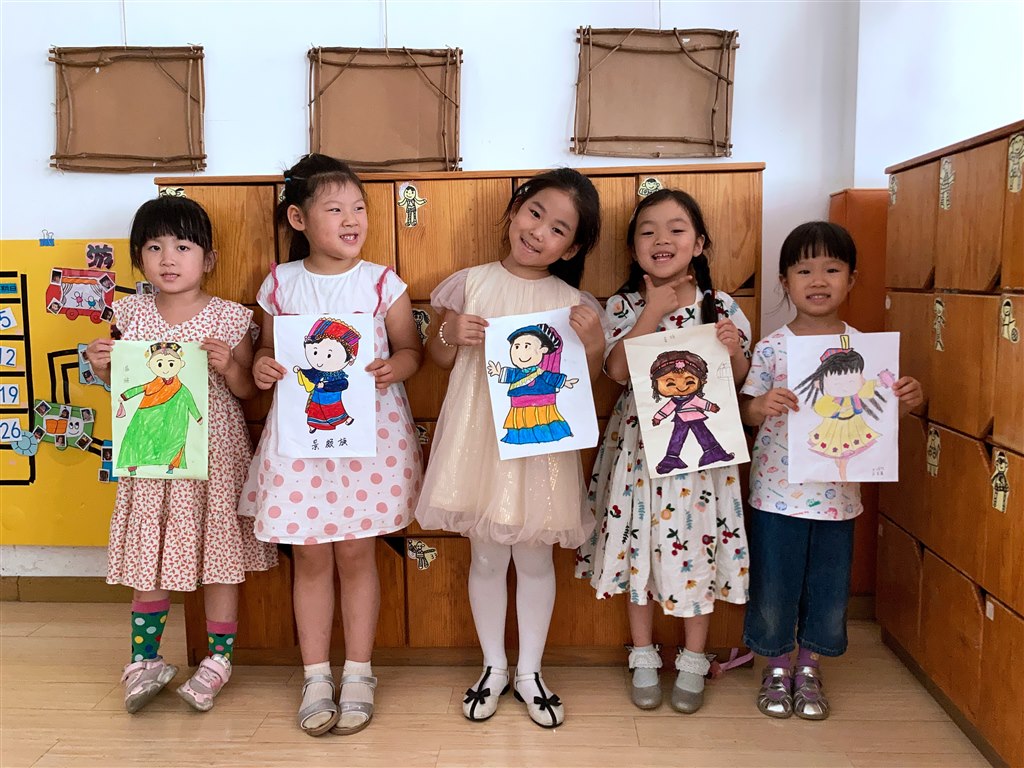 活动中,小朋友自由绘画,把常见民族服饰的色彩和造型装扮尽现在纸上,都创作出了自己喜欢的民族娃娃,共同庆祝亲爱祖国妈妈的生日